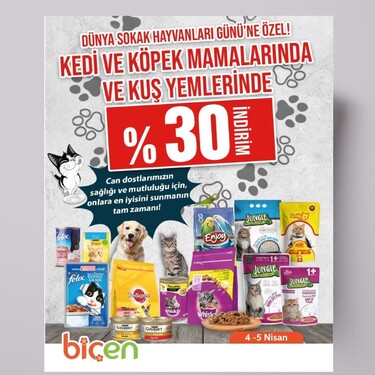 Bu kapsamda, 4-5 Nisan hafta sonu boyunca tüm kedi ve köpek mamaları ile kuş yemlerinde %30 indirim kampanyamızla sizleri mağazalarımıza bekliyoruz. Hem kendi dostlarınız hem de sokaktaki canlar için yapacağınız her alışveriş, iyiliğin çoğalmasına katkı sağlayacak.